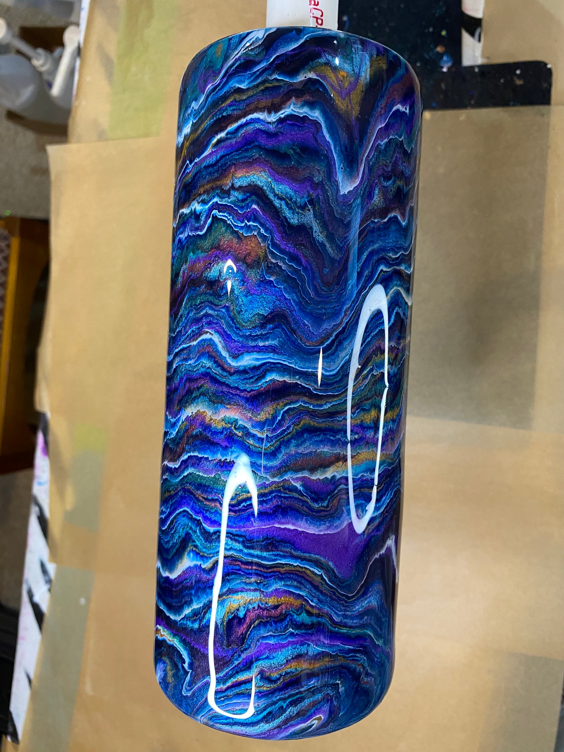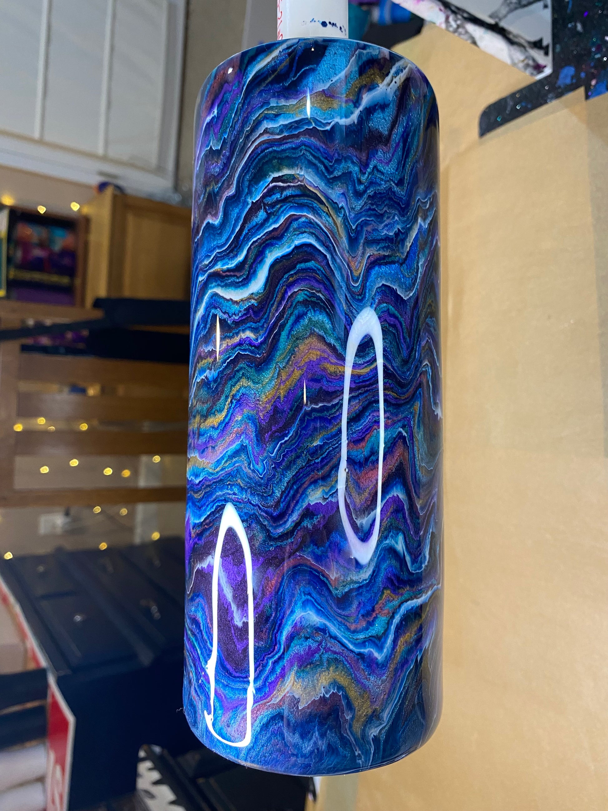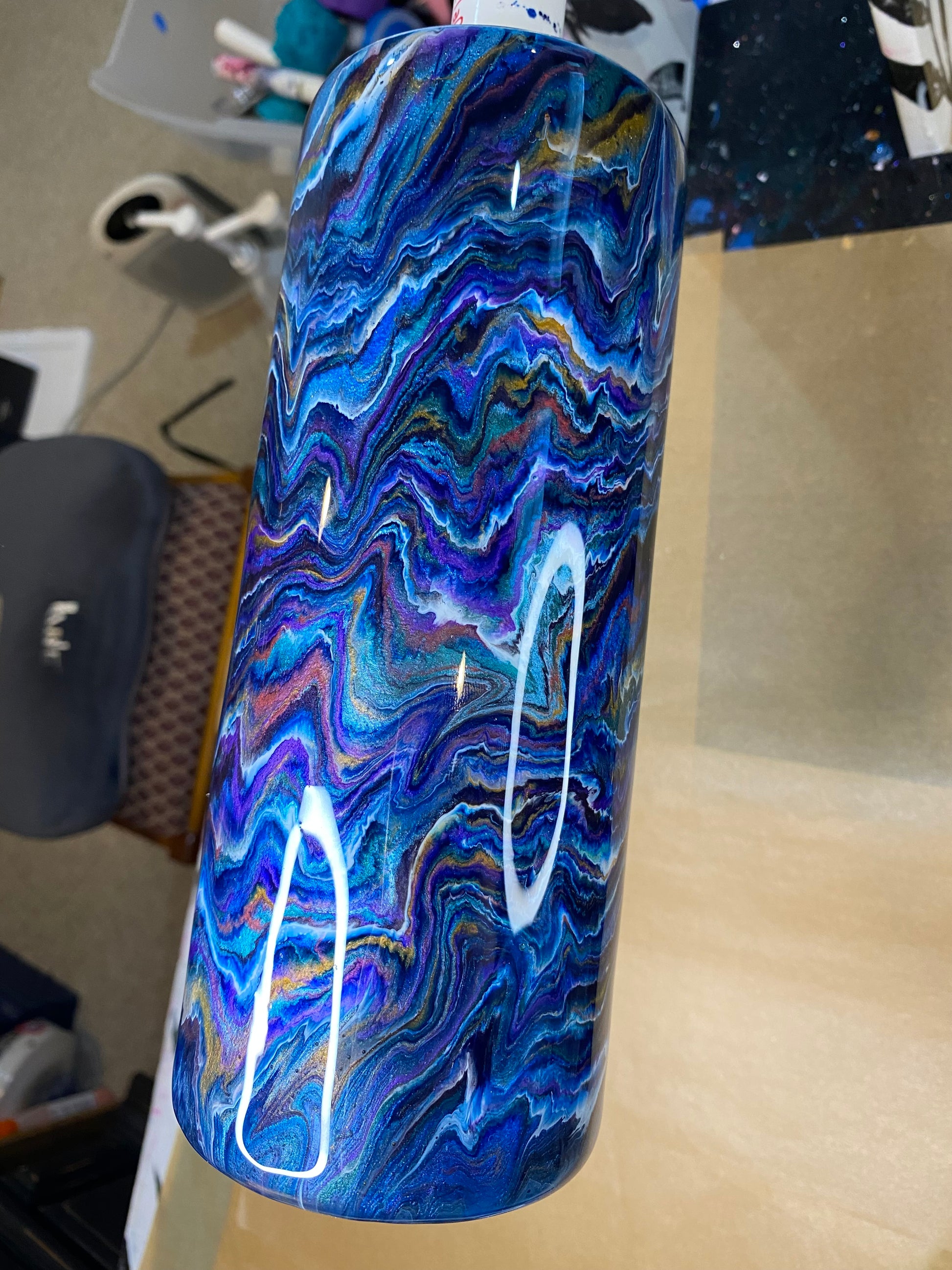 This is an epoxy-resin stainless steel tumbler created in my home studio.